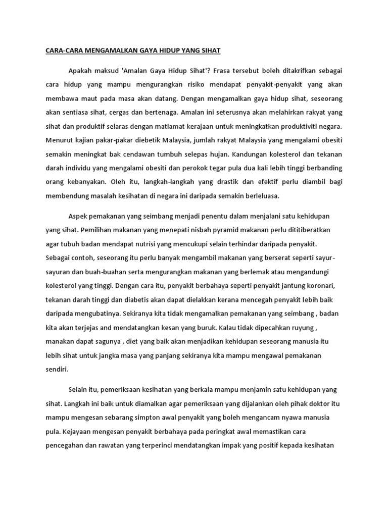 Karangan berpandu diubahsuai daripada karangan hasilan nurul ashikin bt. Begitu juga dengan makanan daripada rantaian restoran makanan segera yang menyediakan burger, pizza dan ayam goreng. Terdapat beberapa cara yang boleh dilakukan untuk memupuk amalan gaya hidup sihat. Contoh karangan amalan gaya hidup sihat dan isi penting 1. Namun begitu, tidak semua tahu cara dan mahu mengamalkan gaya hidup yang sihat.